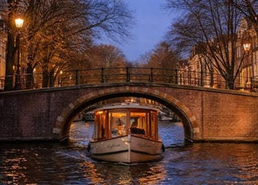 The most authentic way to experience Amsterdam. As daylight fades, the canals become layered reflections — architecture, water, and light merging into one continuous surface. The city slows, and you move with it.