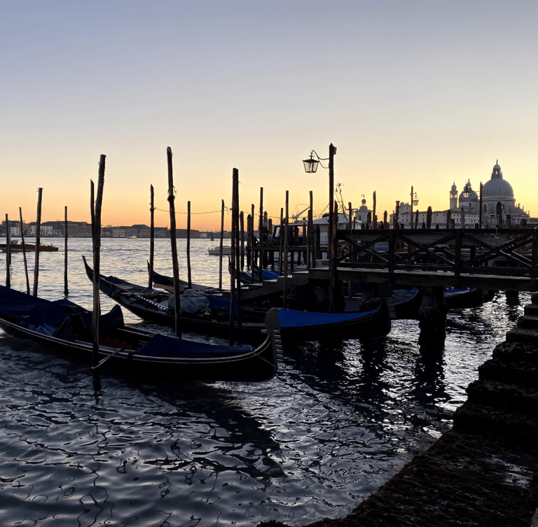 Gondolas rest silently, tied to wooden poles worn smooth by time. They move gently with the water, not going anywhere, simply existing within the rhythm of the morning.