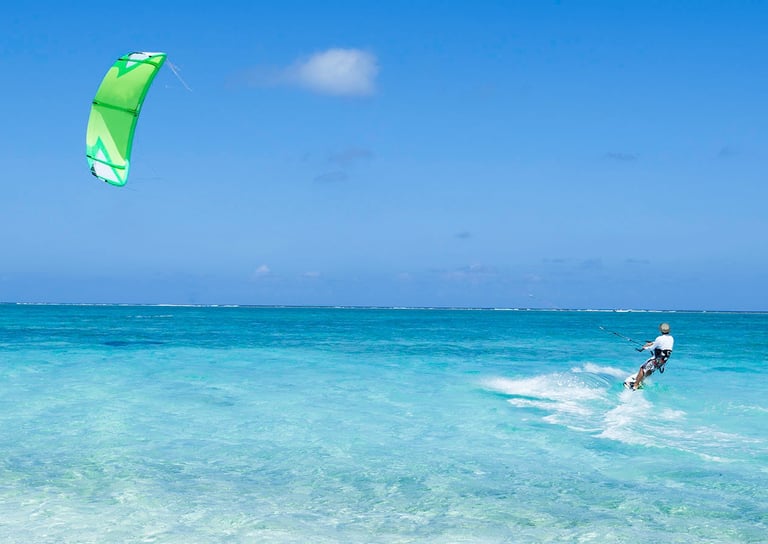 On the island’s quieter side, Long Bay stretches wide and open. Shallow turquoise waters and steady trade winds shape a softer, more elemental rhythm.